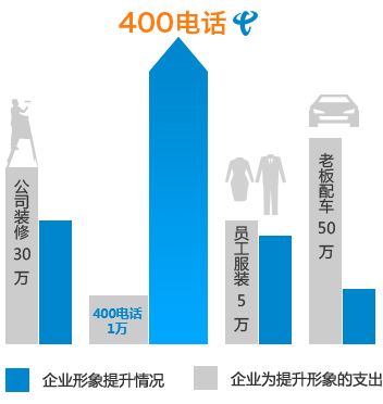 投入1万办400电话,投入5万给员工换职业装,投入30万装修、投入50万买宝马等等,都是为了提升企业形象。 哪个投入对企业形象提升最有力?哪个性价比最高?职业装、装修、宝马都需要客户上门才能发觉,而一个400电话,只要客户与贵公司联系就能发觉。 几乎没有人会怀疑使用8888、6666、0000这样号码的公司是没有实力的公司、是不注重客户服务的公司!无须太多投入,只需换个思路,选个好号码,是提升企业形象性价比最高的选择。