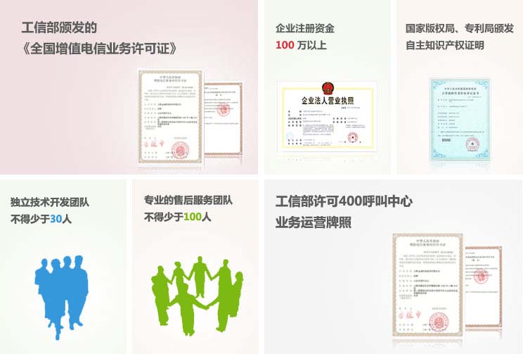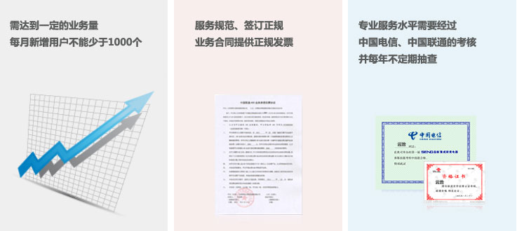我们完全符合以上标准,有全部 运营牌照与许可证,我们是 中国电信、中国联通官方授权服务商。