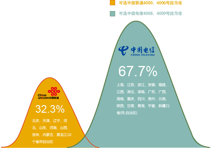 如图例所示,在中国南部如广东地区, 中国电信是主运营商,企业一般都使用中国电信的固定电话线路,则企业400电话选择中国电信4008、4009号码段为宜,而在中国北部如北京地区,中国联通是主运营商,企业一般都使用中国联通的固定电话线路,因此400电话选择中国联通的4000、4006号码段最佳。 我们建议用户在选择400电话前,先确认下自己公司所属地区目前使用的固定电话线路是中国电信还是中国联通,再选择400号码段。